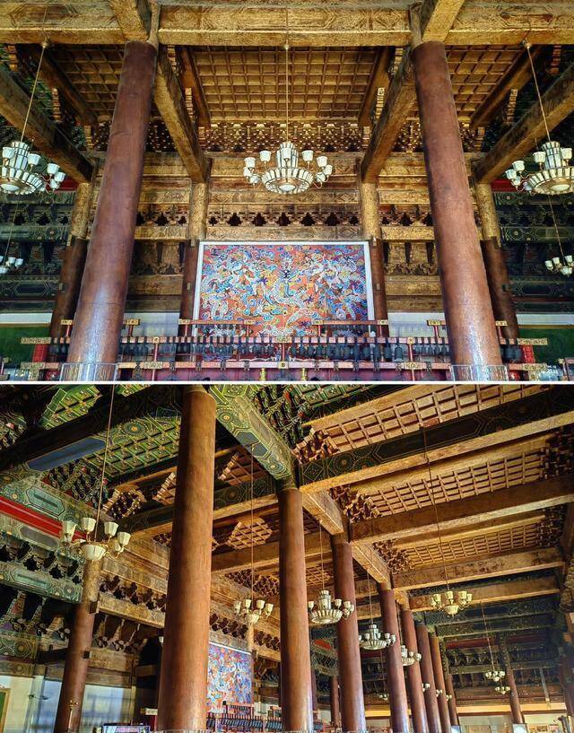 四座大殿中,北海公园的大慈真如宝殿,有着最特有的“素颜之好意思”。建于明万积年间的这座大殿,是中国现有最完整的明代金丝楠木大殿,更艰巨的是,它是一座“从里到外、从结构到装修”的纯金丝楠木建筑——梁、柱、枋、檩、斗拱、门窗,全部由金丝楠木打造,不施一寸彩绘,不涂一滴油漆,十足展现木料自身的当然之好意思。这种“赤膊上阵”的设备神志,是对金丝楠木最大的自信。金丝楠木自身色泽典雅,呈温润的黄褐色,纹理中藏着缕缕金丝,亚搏体育app中国最新版本在光辉照耀下会折射出轻柔的光芒。工匠们没灵验繁复的彩画去遮蔽这份自然之好意思,而是让悉数木构件素面朝天,不披麻挂灰,最大限度地保留了木料的自然纹理和色彩。历经近四百五十年齿月浸礼,这些金丝楠木已呈现出深千里温润的古铜色,摸上去概括如玉,仿佛岁月的陈迹都被千里淀成了特有的质感。与太庙的金碧辉映比较,大慈真如宝殿多了几分禅意与古朴,它静静地伫立在北海的琼华岛上,与周围的山水相融,既不张扬,又难掩风华。在这里,建筑不再是皇权的记号,而是成为了东说念主与当然、与信仰对话的弁言,金丝楠木的自然之好意思,与释教的清净粗浅井水不犯河水,让东说念主在仰望殿宇时,内心也随之千里静下来。