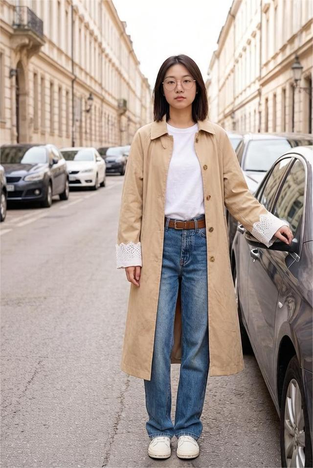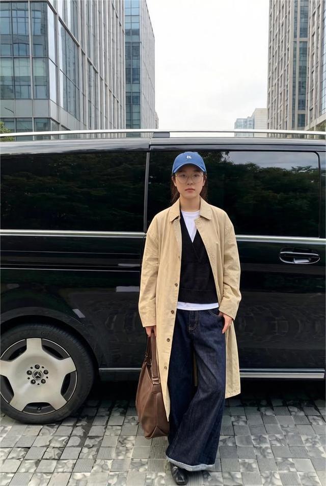 除此除外,巨匠也不错尝试蓝色牛仔裤与之搭配,算作老搭档,卡其色风衣和蓝色牛仔裤总能带给东说念主出东说念见解想的惊喜,平时外穿卤莽不会出错。