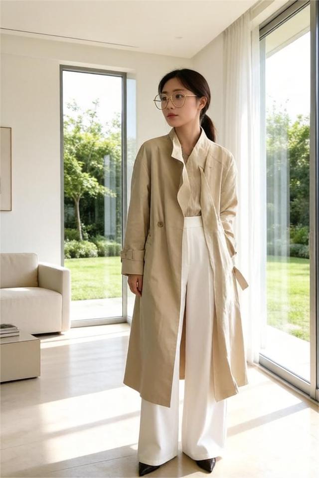 在举座造型中,除了东说念主们视觉中心的风衣和内搭外,巨匠也要雅致挑选下装,在激情接管上,纯白色以黑马之势拔得头筹,不管纯白色长裤如故半裙,与卡其色风衣搭配总能让东说念主目下一亮。