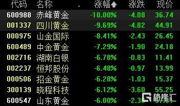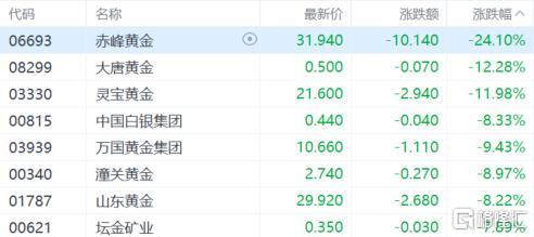 受黄金价钱连累,港A商场贵金属板块全线退让。A股商场贵金属板块指数下挫逾6%,个股中,赤峰黄金跌停,四川黄金跌超9%;港股商场,赤峰黄金大跌超24%,大唐黄金跌超12%,灵宝黄金跌超11%。