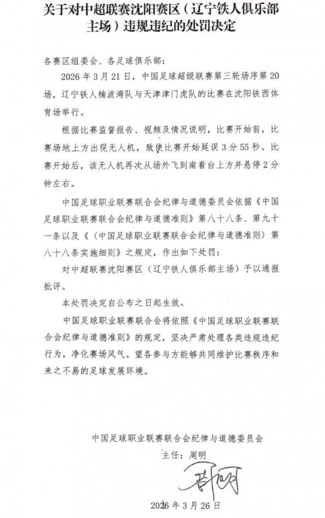 直播吧3月27日讯 由于辽宁铁东说念主主场对阵津门虎的比赛中出现无东说念主机,因此中足联对沈阳赛区(辽宁铁东说念主俱乐部主场)赐与了通报月旦。