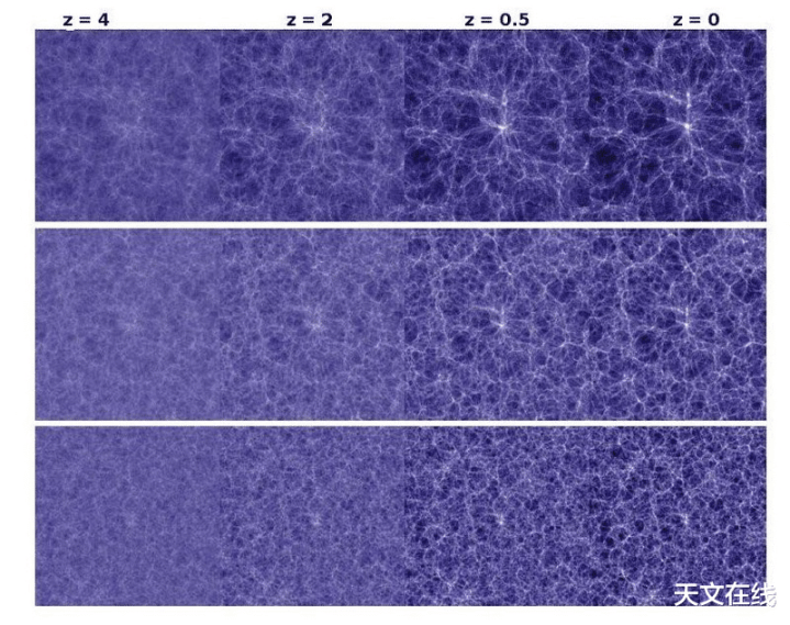 宇宙大轨范结构的演化,从早期的均匀景色到咱们如今所知的成团宇宙。请阻拦,由于引力的有限速率,更大轨范的结构比更小轨范的结构造成得更慢、更晚。若是改动咱们宇宙中暗物资的类型和品貌,将会产生一个人大不同的宇宙。若是这是一个能很好描述现实的模子,咱们所看到的光应该来自该框架内展望的天体物理源,不会有其他过剩的来源。来源:R.E.安古洛等东谈主,《皇家天文体会月刊》;杜伦大学