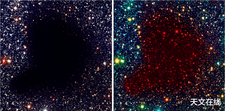 照实,就咱们目下所知,它里面莫得恒星,因为即使是红外千里镜也无法探伤到任何恒星。不外,咱们不错详情它背后有普遍恒星——当咱们用对这些暗星云部分透明的更长波长的光不雅察这片天际区域时,这些恒星就会暴深入来。