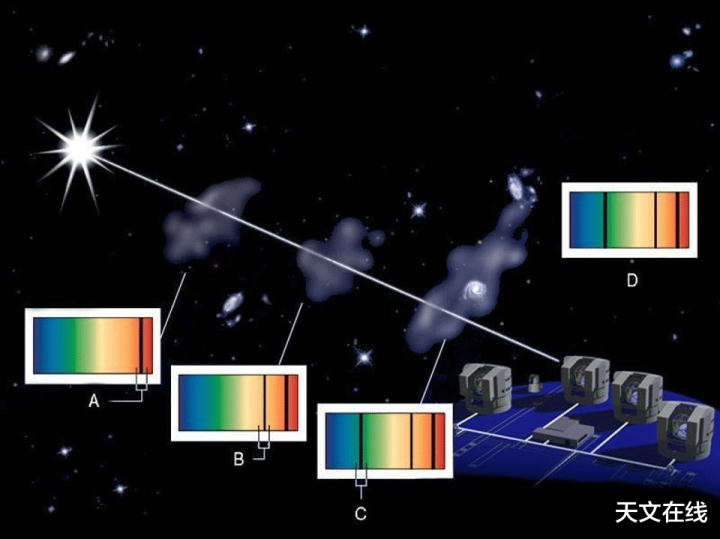 远方的光源——来自星系、类星体,以致宇宙微波布景——必须穿过普通物资云。咱们不雅测到的接管特征使咱们大约测量中间气体云的好多特色,包括其中轻元素的品貌和电离进度。图片来源:埃德扬森欧洲南边天文台