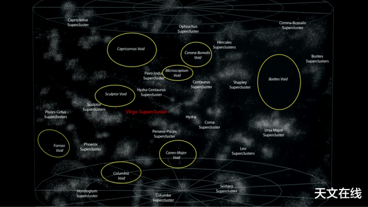 宇宙中巨大的星系团与纤维结构之间存在着巨大的宇宙空泛,其中一些空泛的直径可达数亿光年。恒久以来以为宇宙由跨度达数亿光年的结构(即这些超大超星系团)维系在一谈的不雅点现已获取说明,而这些巨大的网状结构注定会被宇宙推广扯破,同期宇宙空泛将不绝扩大。唯有相互拘谨的单个星系、星系群以及星系团会留存下来。