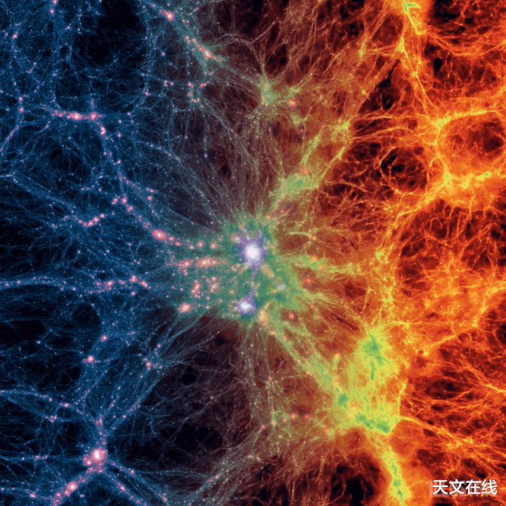 诚然暗物资集聚(紫色,左侧)似乎能安然决定宇宙结构的造成,但普通物资(红色,右侧)的响应会严重影响星系及更小轨范上的结构造成。暗物资和普通物资以允洽的比例共同存在,才能诠释咱们所不雅测到的宇宙,而暗能量则是诠释宇宙推广速率如何随时辰演变所必需的。宇宙中的结构造成是分层级的:开端造成微型星团,接着是早期原星系和星系,然后是星系群和星系团,临了造成大限制的宇宙网。来源:Illustris合营名堂Illustris模拟