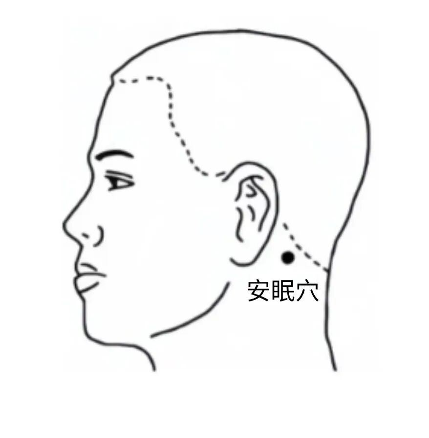 按安眠穴:耳垂后凹下处与风池连线的中点。