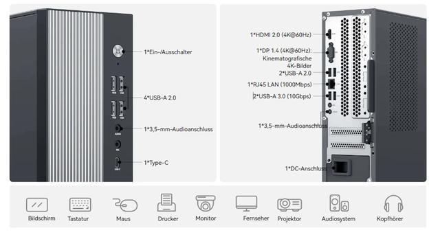 规格方面,这款电脑最多可说合两台 4K 瓦解器,提供 HDMI 2.0、DisplayPort 1.4 接口,前边板带有 4 个 USB Type-A 2.0+1 个 USB Type-C 接口,后头则是 2 个 USB Type-A 2.0 、2 个 USB Type-A 3.0,还带有千兆以太网口。