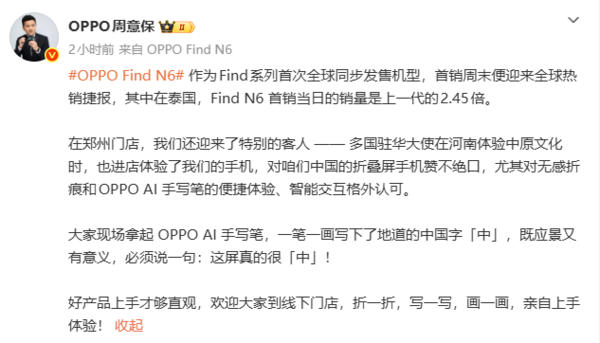 【CNMO科技音问】3月22日,OPPO Find产物进展东说念主周意保在微博称,OPPO Find N6折叠屏手机在泰国商场首销日销量达到上一代产物的245%。国内商场方面,凭证天猫和京东平台的数据,Find N6首销当日销售额创下近一年来全品牌、全口头折叠屏产物的首销日新高。