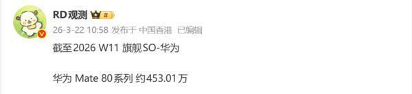 日前,数码博主“RD不雅测”公布了华为Mate 80系列的最新销量数据,把柄数据表示,戒指2026年第11周,华为Mate 80系列累计销量达 453.01万台。公开信息表示,该系列手机于2025年11月28日认真开售,上市于今约四个月。销量比拟上代Mate 70系列有显然教化。华为Mate 70系列上市88天销量约为280万台,这次Mate 80系列同期销量多出近100万台。