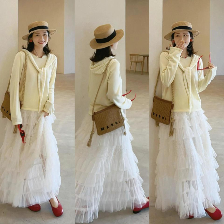 举例用红色玛丽珍鞋配上白色蛋糕薄纱伞裙和浅鹅黄色真挚衫,甜好意思元气与精致氛围感碰撞,让你仙女感完全。