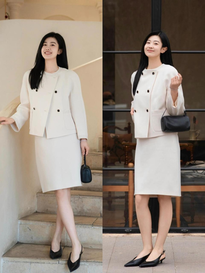 偏疼轻熟风的穿衣造型,不妨径直遴荐一套无领的白色西服裙装,配上玄色穆勒鞋,瑕瑜颜色穿搭经典耐看,更容易打造出利落造型,很相宜职场女性穿去上班。衣服与裙子的明锐线条感更容易晋升先锋的张力。配上尖头浅口穆勒鞋,落拓呈现御姐气质范。