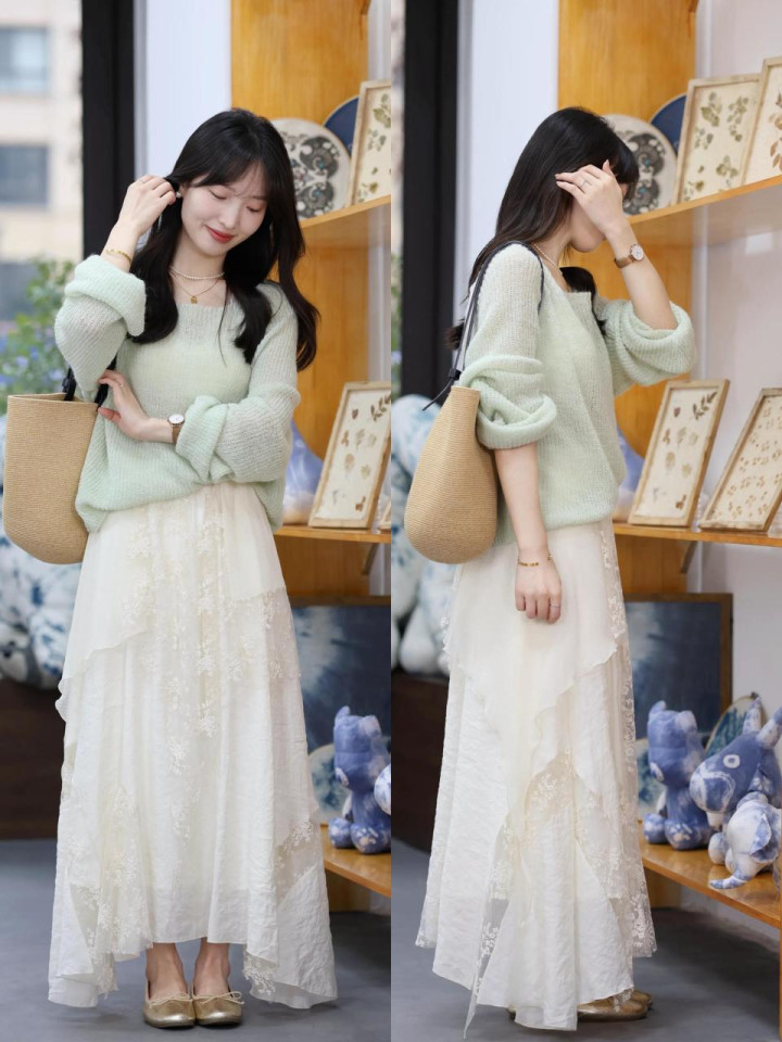 Tips③:浅绿色真挚毛衣+蕾丝刺绣白色伞裙