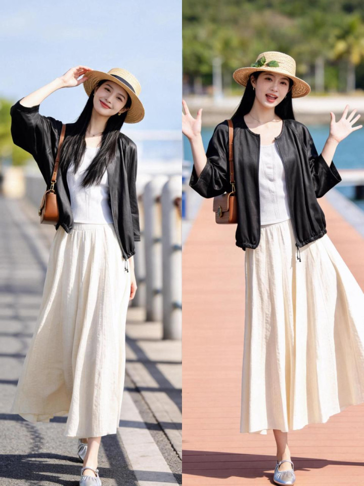 若念念外出上班、逛街约聚、旅游拍照多种场景齐适配的穿衣格调,uedbet(中国)官方网站不妨遴荐一件玄色无领皮衣短外衣,内搭白色打底衫和一条高腰收腰白色伞裙,脚上穿的一对银灰色的玛丽珍鞋,既轻柔又利落,戴上一顶凉帽,氛围感拉满,拍出来的像片也很出片。