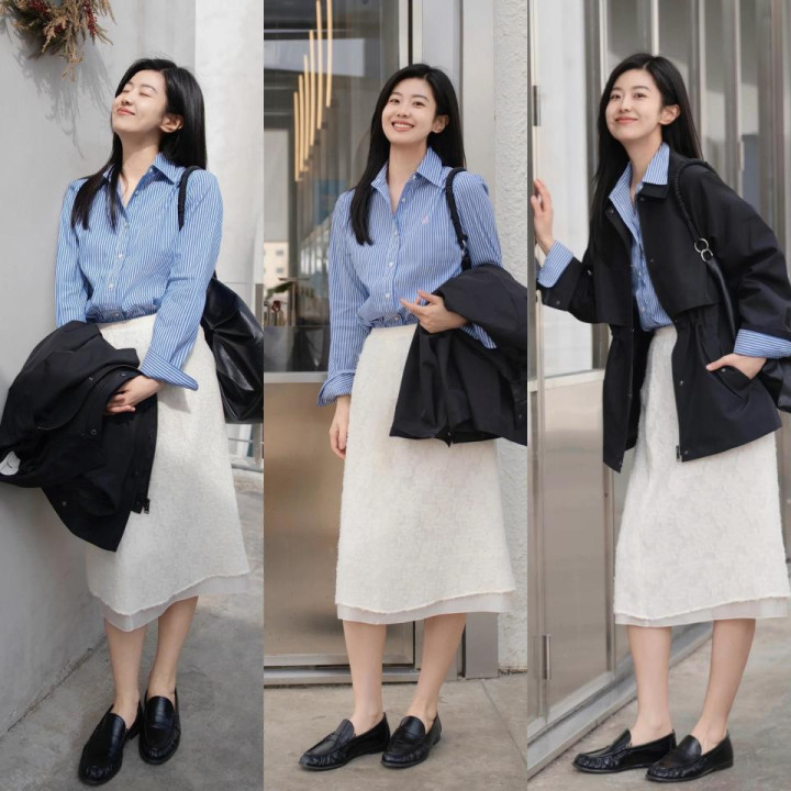 短风衣外衣穿在身上确乎更利落,举例上面这一件玄色短风衣内搭蓝白条纹衬衫和白色的 A 字半裙,脚踩玄色乐福鞋,既千里稳又通勤斯文,合座造型利落又有质感,很上面绪。