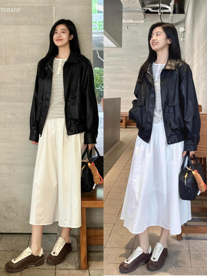 遴荐皮衣外衣时,一定要遁藏超短款,外衣的长度到胯骨的位置最好,举例上面这一套穿搭,用瑕瑜条纹打底衫和玄色皮外衣配上白色长裙,脚上穿的棕色的德训鞋,不冗忙不费时,就能落拓穿出利落又显高的造型。