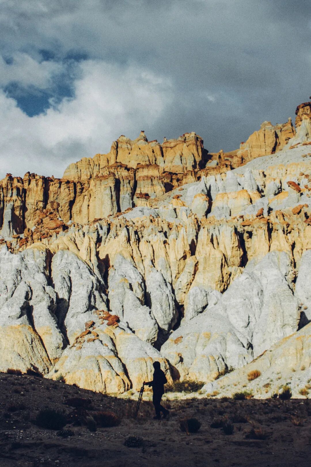 下车后徒步走进沟里。两侧的土林越来越高,越来越密,乍一看有些像成块的菌菇。土林因含有不同的矿物因素而呈现出浅深不一的颜色,却又脉络分明,像是地面的年轮被竖着剖开。天阴郁下来,却给此行此景增添一份异星的设想。
