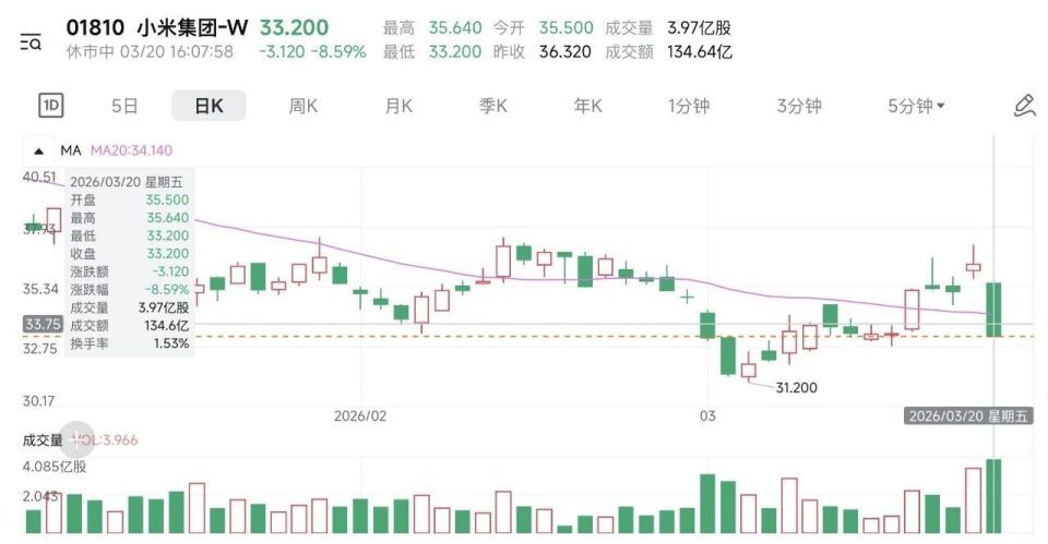 3月20日,港股开盘,小米股价应声大跌超7%。收盘前终末两分钟,跌幅一度扩大至超10%,最终报收33.2港元,跌幅定格在8.59%。