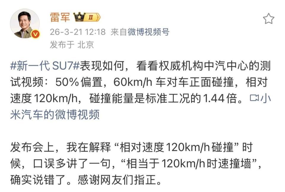 发布会上展示的60km/h双车对撞测试中,即便东说念主为断开12V电源,也能通过三重安全冗余门把手告成开启车门。可这一次,雷军在发布会现场又犯了一个物理异常,但很快发微博更始……