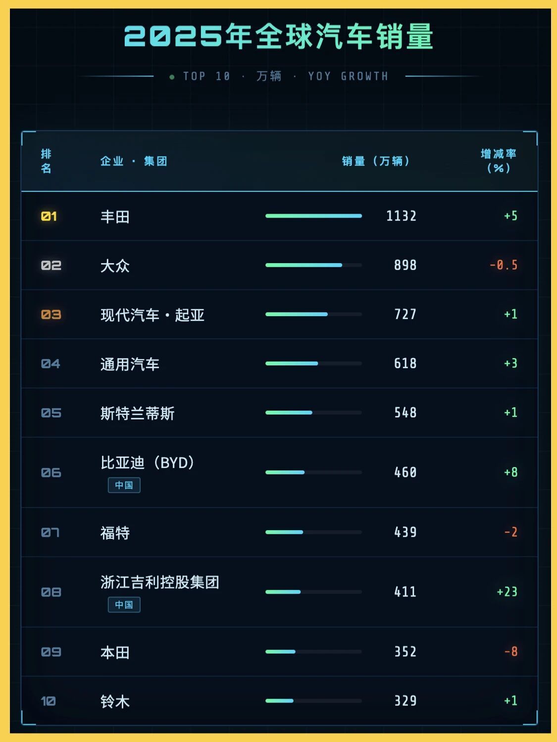 2025 年全年,中国汽车人人阛阓份额达 35.6%,较 2024 年的 34.2% 升迁 1.4 个百分点。在人人销量前二十的汽车制造商中,中国车企占据六席,日本占五席。