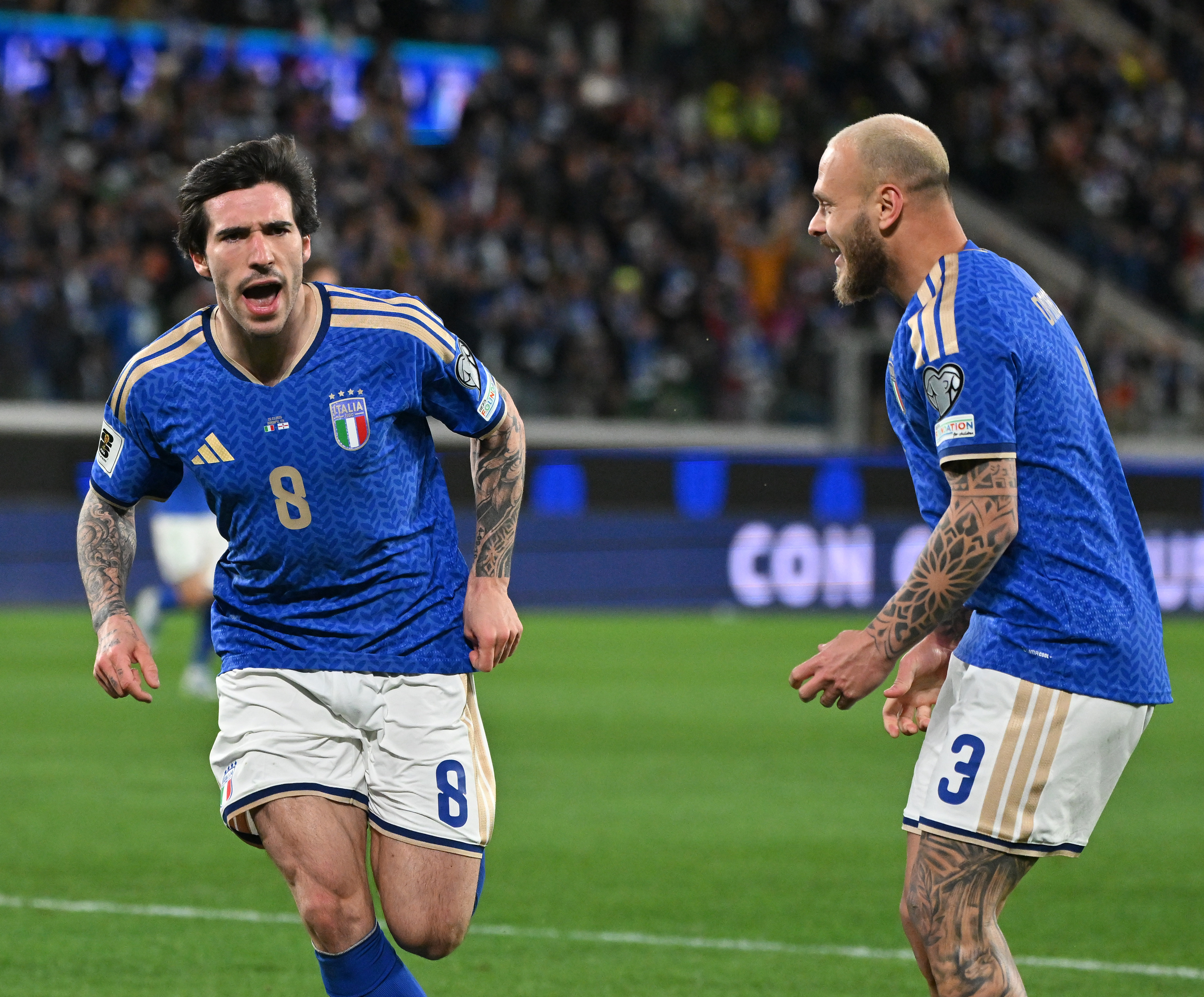 3月26日,意大利队球员托纳利(左)在比赛中攻入球队首球后与队友迪马尔科庆祝。新华社发(阿尔贝托·林格利亚摄)