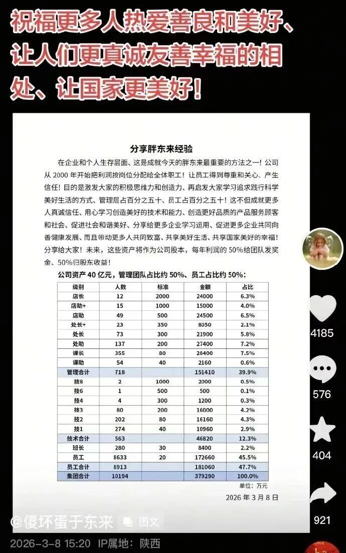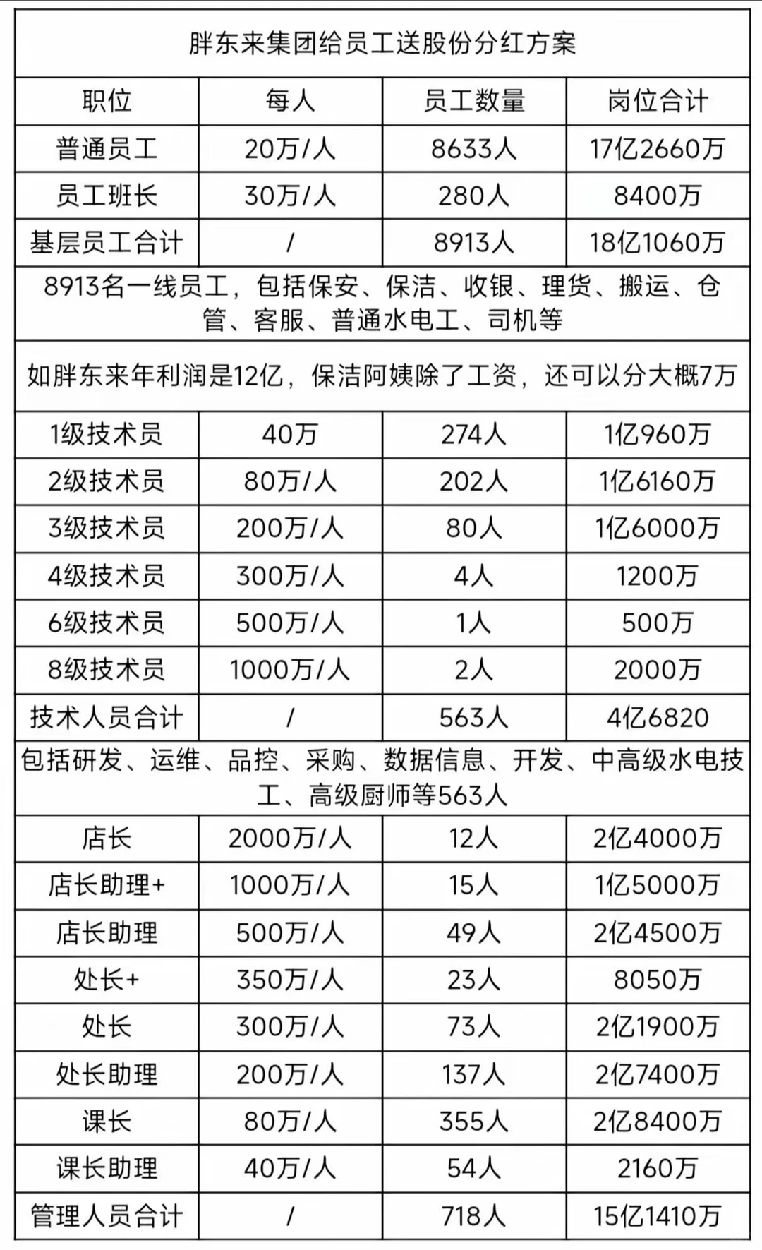 你没看错,高管、鼓动、超市理货、收银、搬货、保洁等下层职工,这就算齐有股份了,是公司的主东说念主翁了。对了,年前,于东来还说过:“公司八千多名职工,税后平均月入九千块,净利润大略十五亿,平均每东说念主能分十万。”此次然则现款哦。