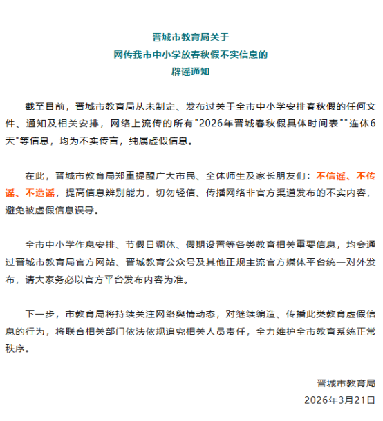 亚搏体育app中国最新版本 晋城市中小学2026年放春秋假?当地老师局:未发过联系奉告