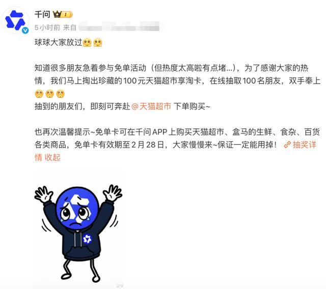 本年春节,阿里千问精致上线“春节30亿免单”,披发奶茶免单卡,当日,就灵验户反馈,活动出现职业器卡顿问题。千问App客服中心发布公告回答称:“由于活动火爆,咱们正在紧迫加资源,全力保险顺畅,提议换个本事再来。”