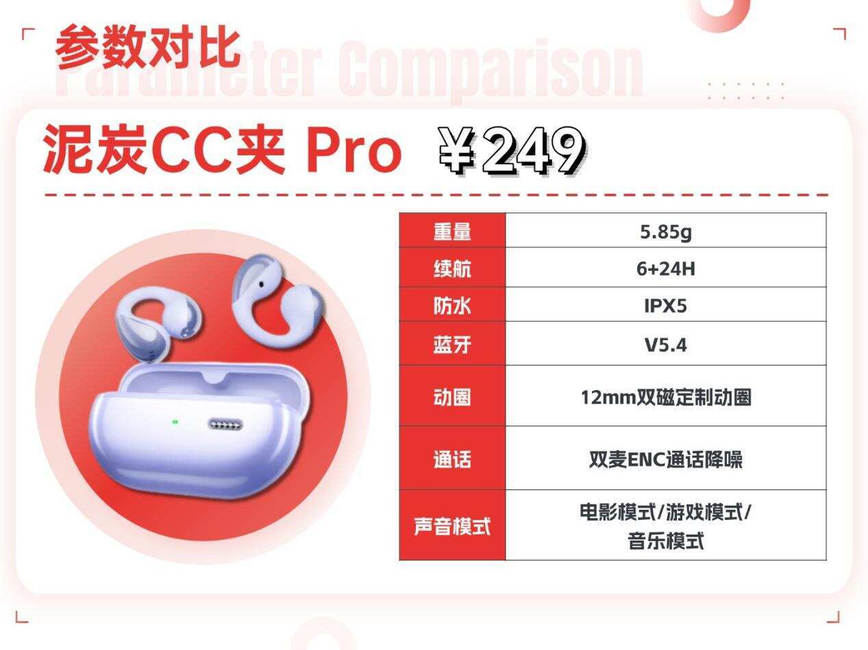 要是预算在 200-300 元之间,已往最爱用耳机追剧、打游戏,垂青影音文娱的千里浸感,那可以选泥炭 CC 夹 Pro。249 元的价钱,有三种专属的声息形态,搭配 360° 全景空间音效,看剧打游戏的体验感拉满,音质和佩戴舒规定也皆在线,等于续航稍短,相宜影音需求刚劲于理会、长续航需求的用户。