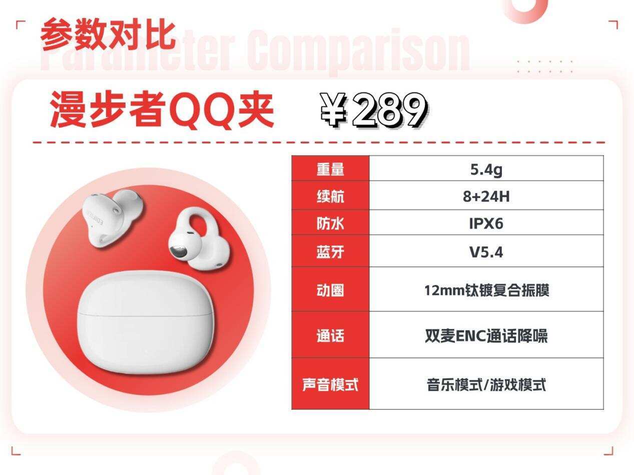要是预算在 300 元傍边,想选一款玄虚性能强、莫得显明短板的,那踱步者 QQ 夹会更合适。289 元的价钱,音质耐听、三频平衡,佩戴的幽闲性和舒规定皆可以,IPX6 的高防水品级还能适配体育场景,日常使用、轻度理会皆能 hold 住,相宜不想在音质、佩戴、防水任何一方面和洽的用户。