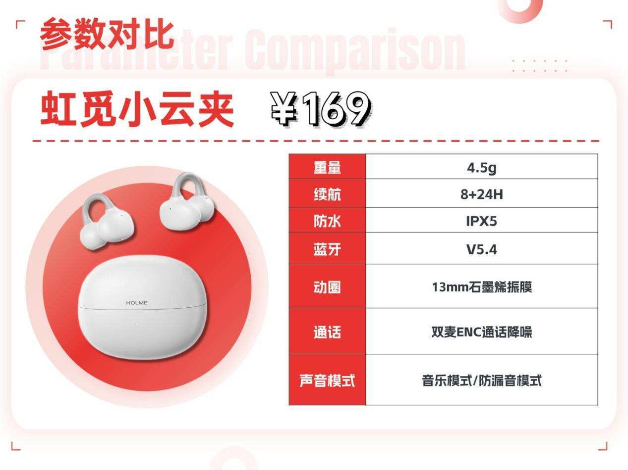 虹觅小云夹订价 169 元,是三款里性价比杰出的一款,虹觅行动专注绽放式耳机的新品牌,这款居品没作念过剩的功能堆砌,全是贴合日常使用的实用建立。单耳 4.5g 的分量是三款最轻,13mm 石墨烯振膜动圈在三款里尺寸最大,为听感打下了硬件基础,还贴心作念了同价位稀有的防漏音形态,8+24 小时的续航加上 IPX5 防水,日常外出、通勤用完全够使,百元档能作念到这个建立,实用性很到位。