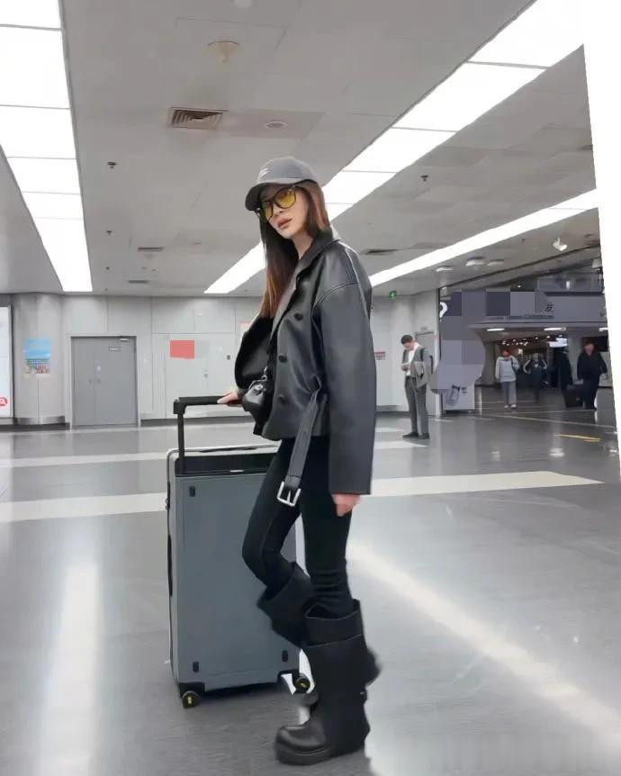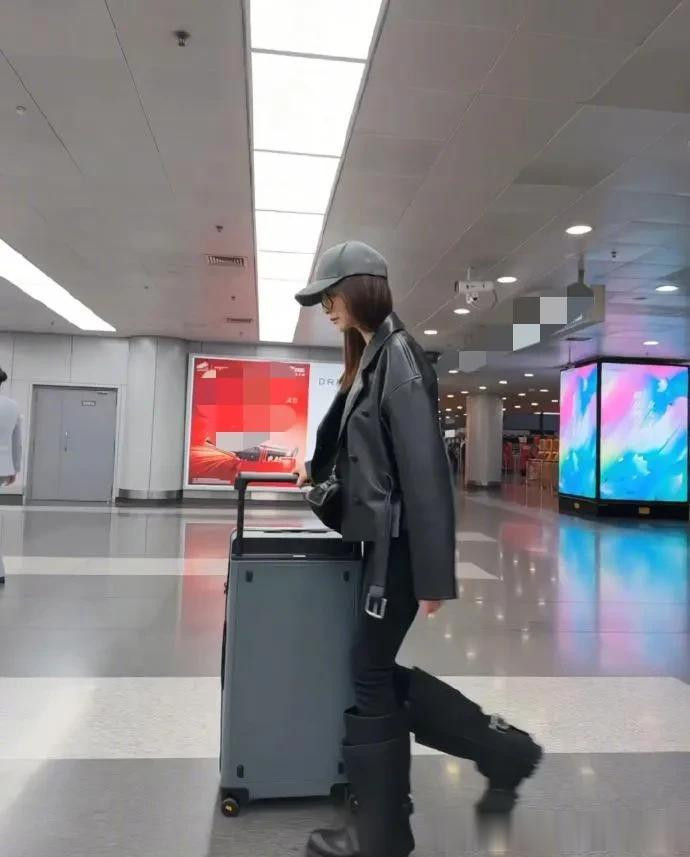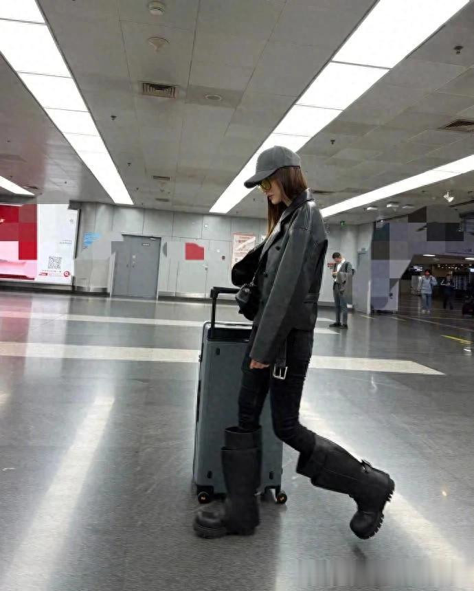 亚搏体育app 李小冉机场私服真会穿! 皮夹克+小黑裤+长筒靴, 好意思丽洋气又高档!